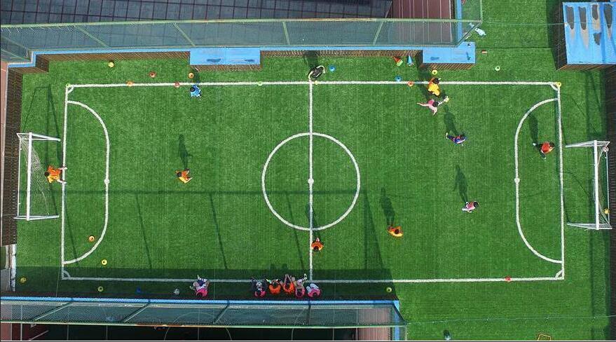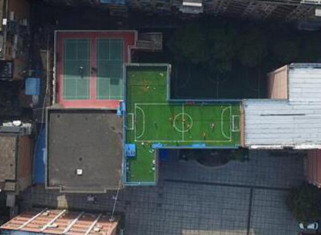位于教学楼五楼楼顶的小球场长约20米,宽约10米,球场四周由铁栏杆和绳网组合成“围挡”,球场和休息区面积不到300平方米,